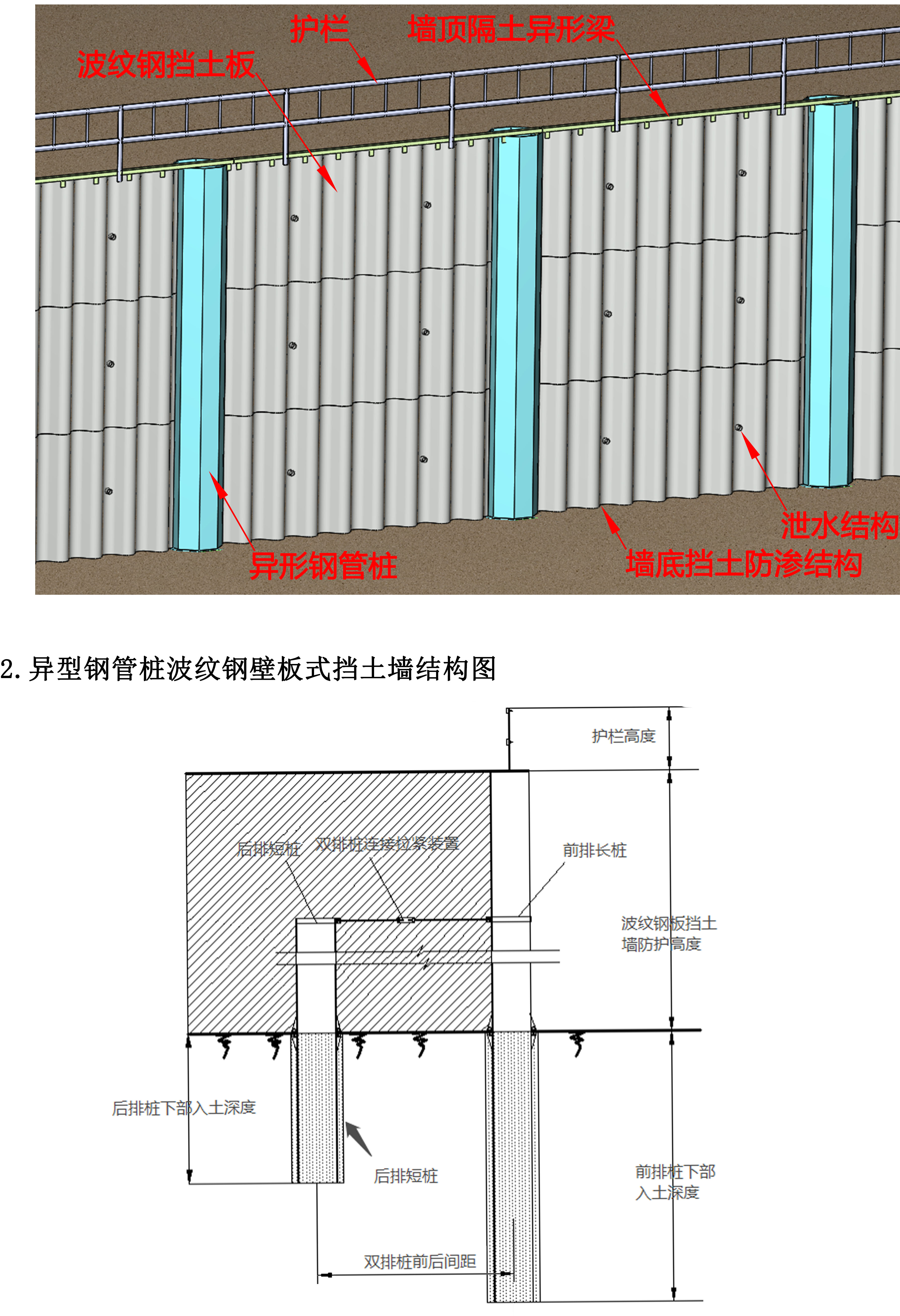 1、異型鋼管樁波紋鋼壁板式擋土墻整體示意圖