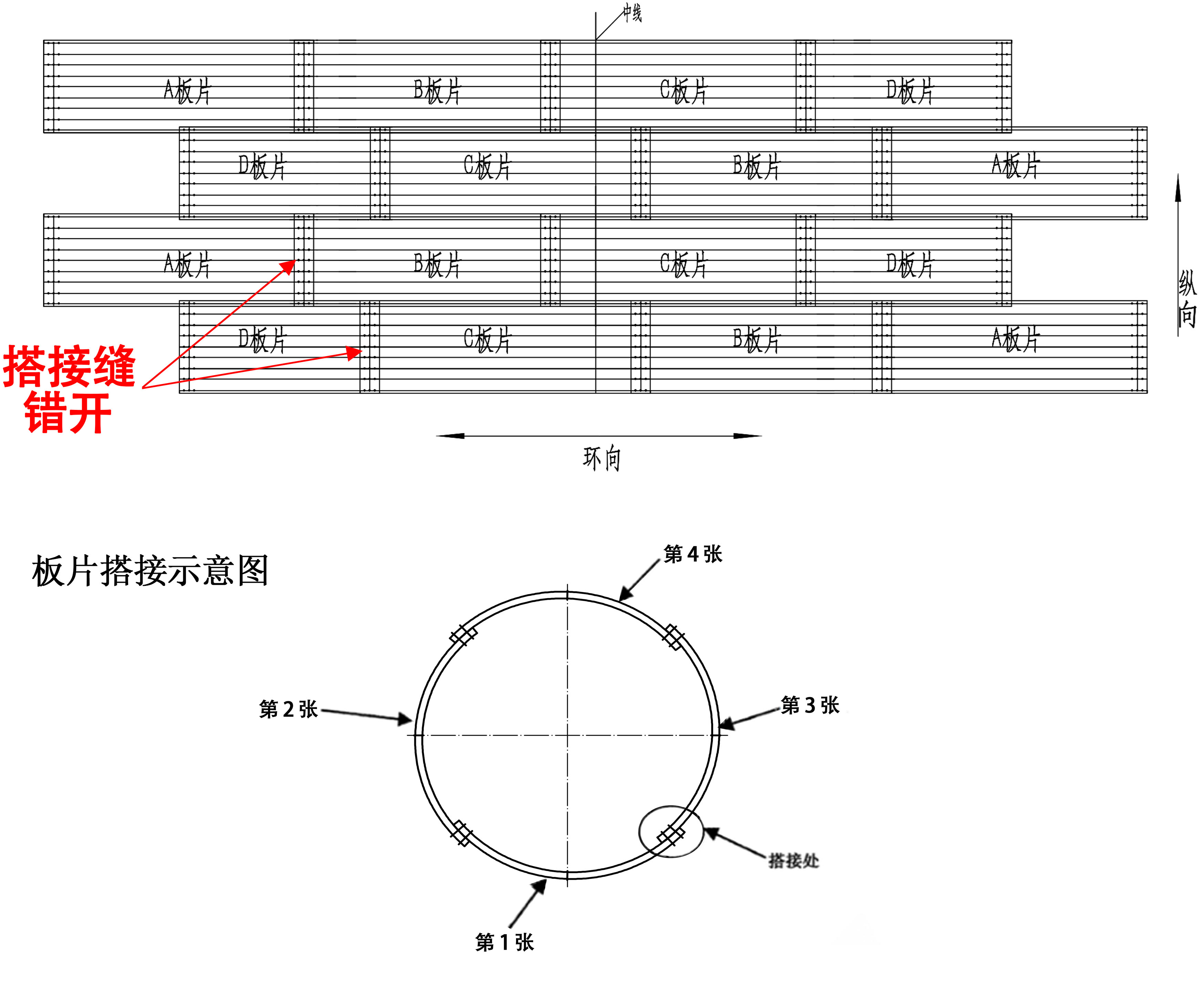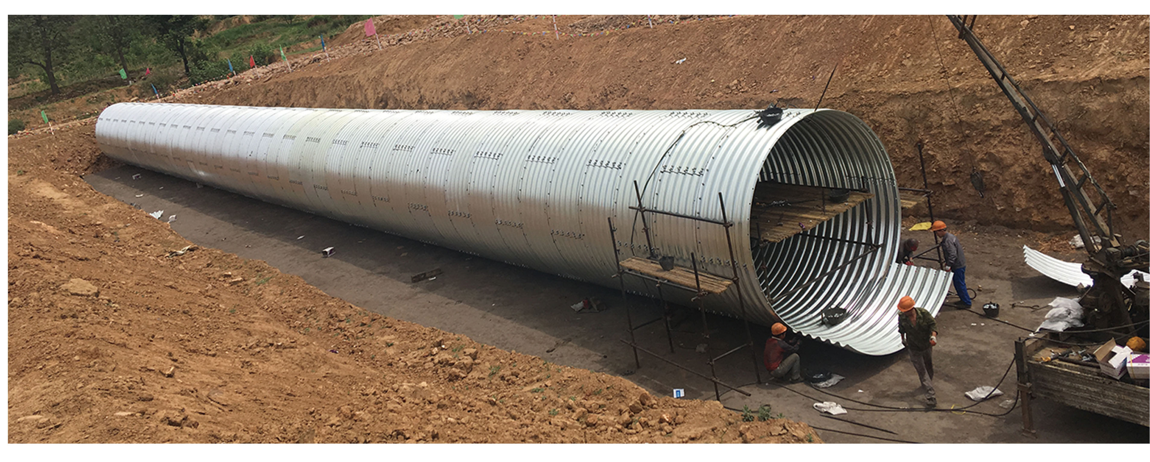 (1)在組裝波紋管時,以中心軸線定位第一張紋板,以此為起點向軸向與徑向延伸,直至設(shè)計直徑與長度。第二張板疊在(搭接部分)第一張板外側(cè),對正連接孔,螺栓由內(nèi)向外插入孔,依次裝好凸、凹墊節(jié),并用套筒扳手預(yù)緊螺母。第三張對稱拼裝在第張的另一端內(nèi)側(cè),對正連接孔,由內(nèi)向外裝好并預(yù)緊螺母;第四張拼裝在第二塊板外側(cè)、第三塊板內(nèi)側(cè),封閉整個截面,進行測定截面形狀,調(diào)整每塊波紋板,再預(yù)緊螺母。以此再繼續(xù)拼裝第二節(jié)。拼裝第二節(jié)時,可選第一節(jié)任意一端端口為起始端(也可兩端同時拼裝向外延伸)。第二節(jié)外切于第一節(jié),此安裝方法與第一節(jié)相同。拼接時根據(jù)搭接疊縫軸向的錯位和相互疊壓,算好與第一節(jié)搭接處孔的位置,以保證后續(xù)兩塊外切板的繼續(xù)拼裝。同理,進行第三節(jié)的拼接(第三節(jié)內(nèi)切于第二節(jié)),以此直至設(shè)計要求長度。