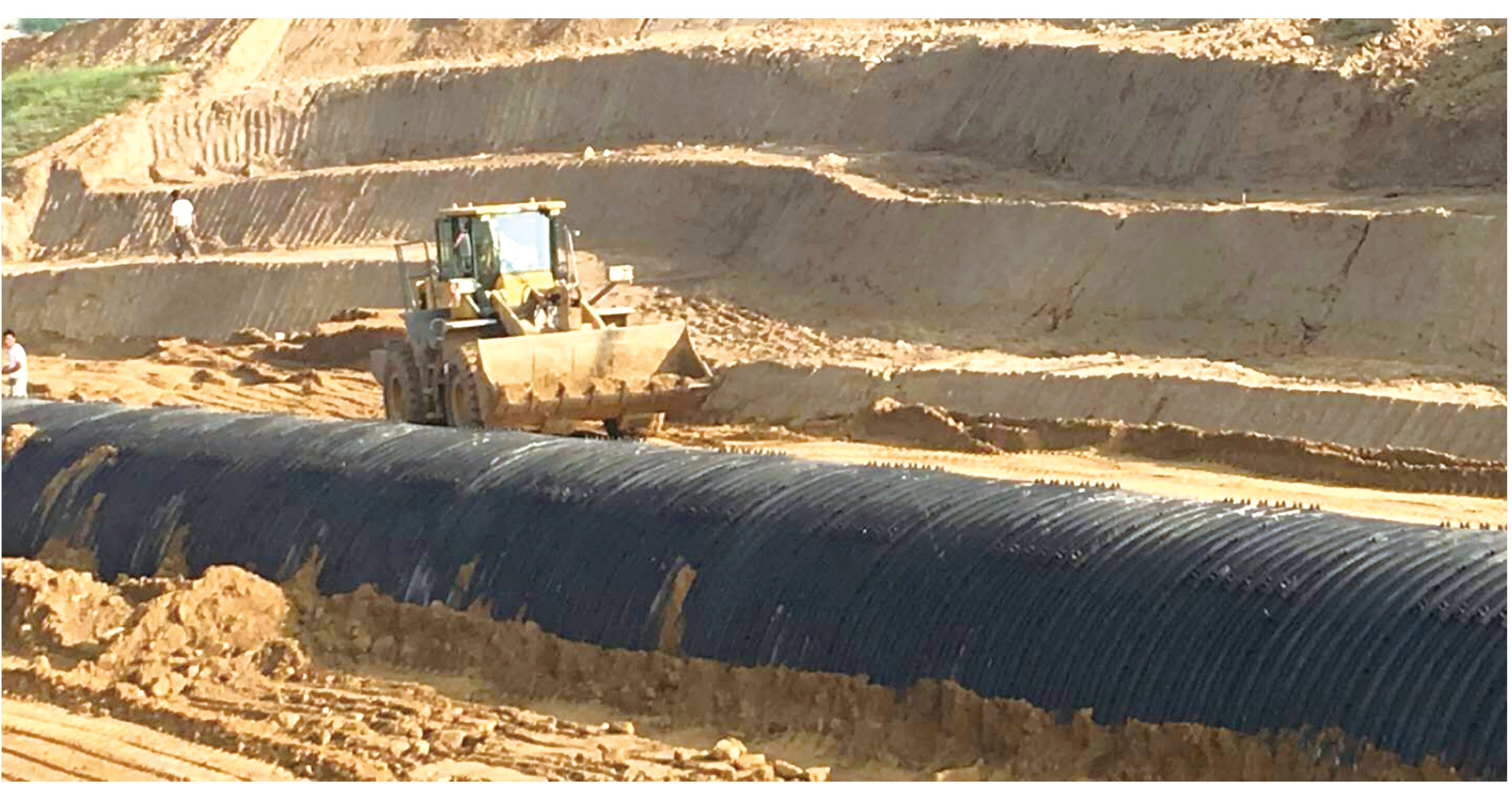 回填是鋼波紋管施工過程中最為關(guān)鍵的一道工序,施工單位必須高度重視,嚴格按照設(shè)計要求和施工規(guī)范執(zhí)行。回填時必須保持兩側(cè)對稱進行、分層攤鋪、逐層壓實,每層厚度不宜大于20-30cm,壓實度不小于95%。交替回填施工時,兩側(cè)高度差不大于一層壓實厚度,由偏土壓力引起的結(jié)構(gòu)物變形,應(yīng)采取措施校正截面形狀后重新壓實。